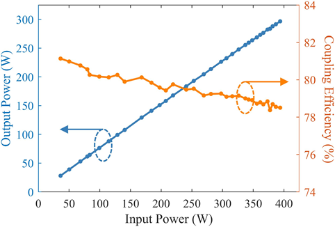 图3 基于空芯光纤的高功率能量传输的输出功率与耦合效率随输入功率变化图
