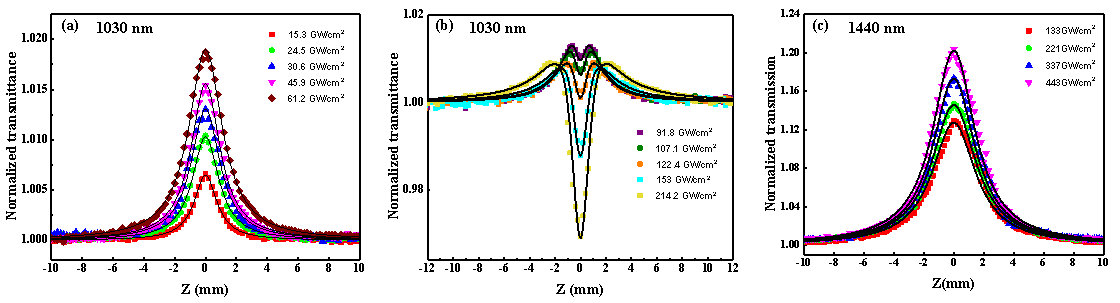 图1 不同波长辐照下ITO薄膜的开孔Z-scan曲线.(a)、(b)1030 nm波长;(c)1440 nm波长。