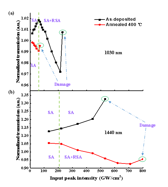 课题组研究了典型ENZ材料(氧化铟锡)在飞秒激光作用下的非线性吸收响应,发现在ENZ波长(1440nm)泵浦下仅表现为SA效应,然而在非ENZ波长(1030nm)泵浦下,随着泵浦光强增加由SA转变为RSA效应。研究解析了非ENZ波段SA和RSA转变的原理:认为SA效应源于导带自由电子的漂白过程,RSA效应源于价带束缚电子的多光子吸收。同时,研究人员提出了薄膜退火技术抑制自由电子浓度实现电子漂白和多光子吸收竞争行为的调控。该方法实现了ENZ波长处120%的饱和吸收到95%的反饱和吸收的调控。