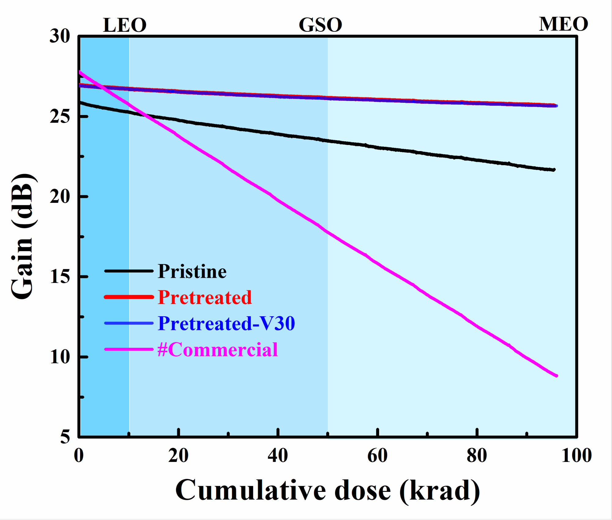 研究团队通过对掺Er石英光纤预制棒进行载气、辐射以及热退火等预处理步骤,成功制备出了高抗辐射特性的掺Er石英光纤。在线实验结果表明,经过98 krad X射线辐射后,其增益仅下降1.3dB(对应于商业掺Er石英光纤下降了19dB)。高真空实验表明,该预处理方法制备的光纤可以在真空中仍然保证长期稳定的高抗辐射特性。该项工作为研制用于空间辐射领域的高抗辐射掺Er石英光纤提供了参考。