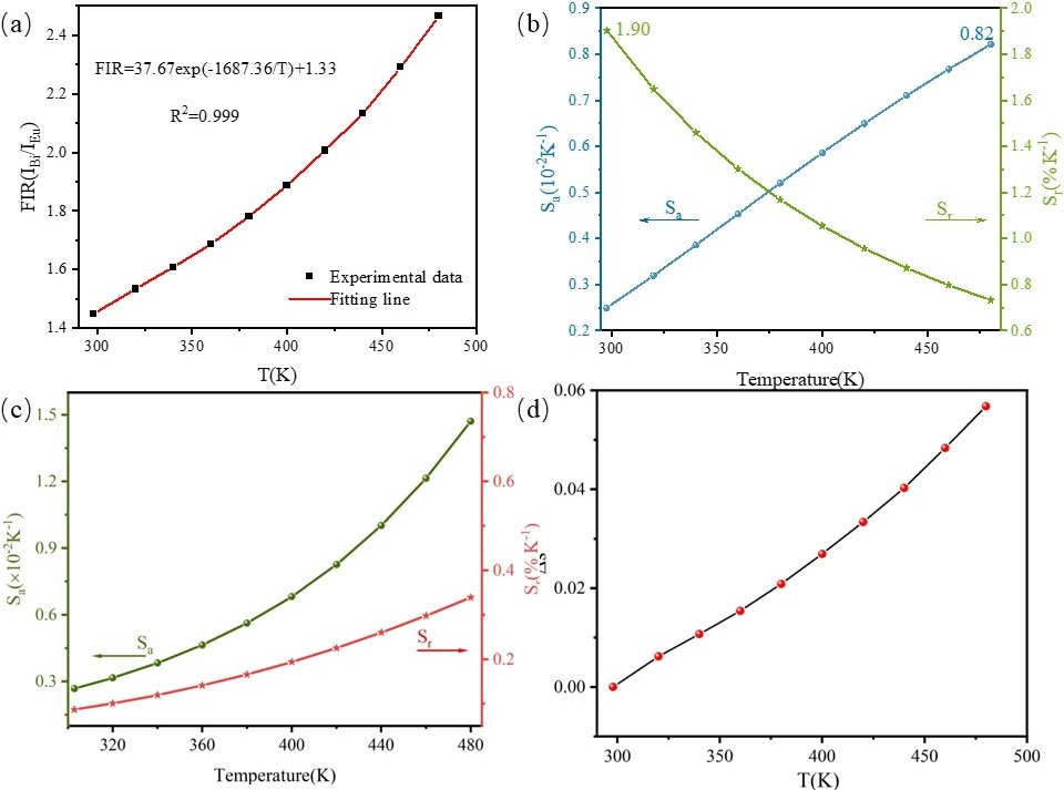 图1(a) 温度依赖的FIR (IBi/IEu)曲线。 (b) 基于FIR技术Sa和Sr随温度的变化曲线。(c) 基于Eu3+衰减寿命随温度变化的Sa和Sr曲线。 (d) 色坐标位移值对应温度的变化曲线。