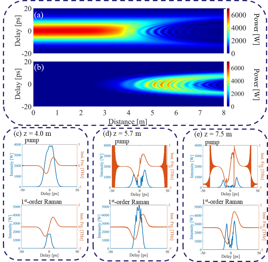 研究者使用基于广义非线性薛定谔方程的数值模型模拟非线性光学增益调制过程中泵浦和拉曼脉冲在光纤中的演化过程: