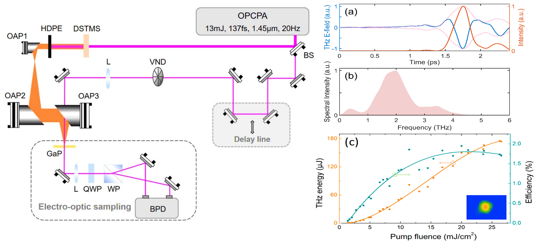 图1 强场太赫兹波的产生和表征。(a)太赫兹时域波形;(b)太赫兹频谱;(c)太赫兹能量和转化效率与泵浦功率密度的依赖关系。