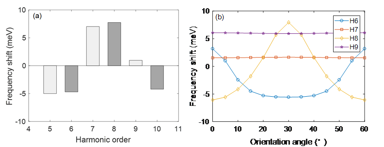 图2. (a)带间光谱不同级次的频移,(b)谐波频移随晶体方位角的依赖关系。