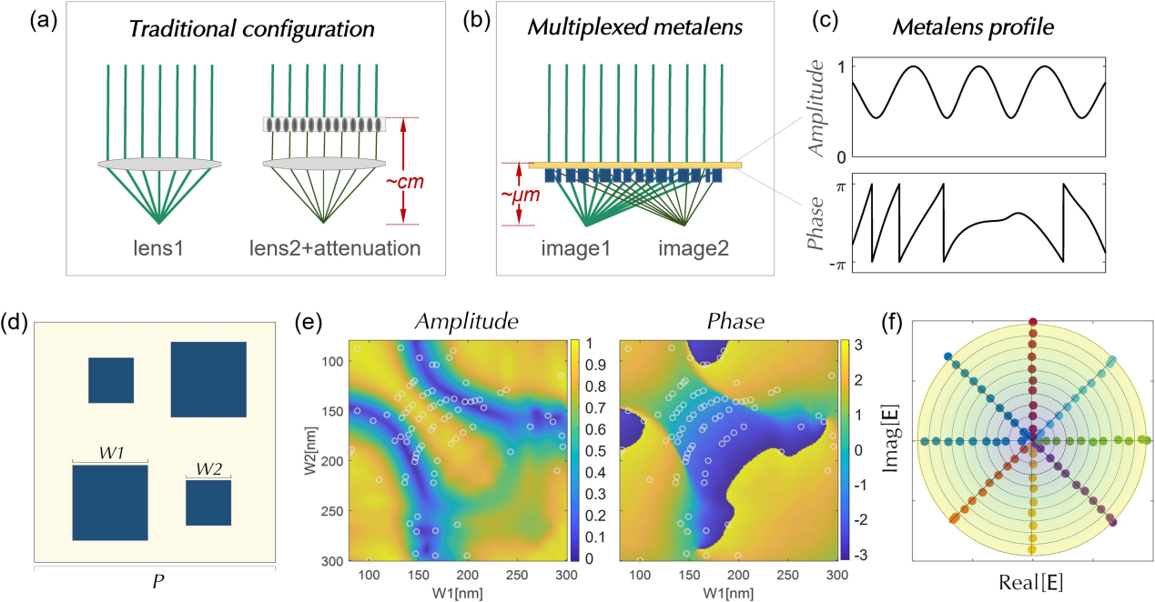 图1 高动态范围成像的复振幅超构表面设计。 (a) 传统单次拍摄双图像获取方案。 (b) 本文提出的复振幅超构透镜,用于在单次曝光中获得双图像。 (c) 图(b)中超构透镜的振幅与相位分布。 (d) 构建该复振幅超构透镜所用的单元结构。 (e) 不同结构参数下的振幅与相位响应。 (f) 图(e)中白圈标记的所选结构在复平面上的复振幅调制结果。