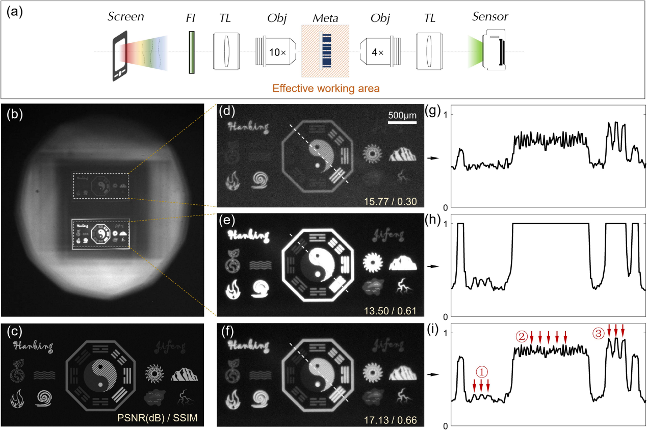 图2 动态范围增强的实验结果。 (a) 实验成像装置,FI:滤光片,TL:管透镜,Obj:物镜, Meta:超透镜。 (b) 系统捕获的原始图像。 (c) 图像的真值。 (d, e) 从(b)中裁剪出的低强度和高强度图像。 (f) 将(d)和(e)融合得到的图像。 (g-i) 从(d-f)中虚线处提取的强度分布。所有图像均以归一化方式显示。