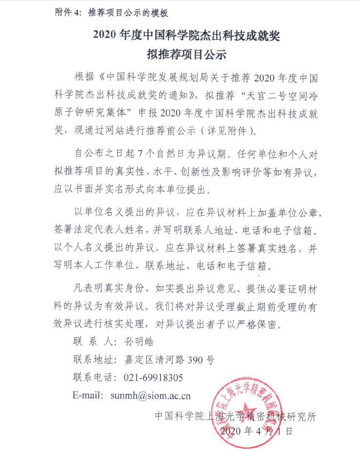 2020年度中国科学院杰出科技成就奖拟推荐项目公示(已结束)