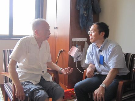 邵建达与抗战老战士促膝交谈,一起回忆革命战争时期的峥嵘岁月。在原副所长、离休干部程明德家中,程老回忆了参加革命的经过。当时,日寇在程老家乡狂轰乱炸,程老的姐姐等亲人不幸死于战火。面对着国恨家仇,程老毅然决然的走上了抗日革命的道路。