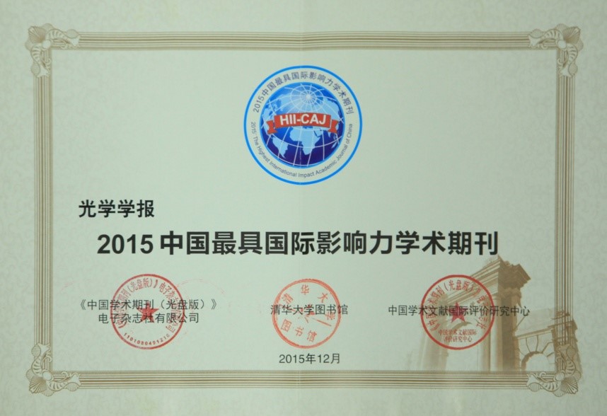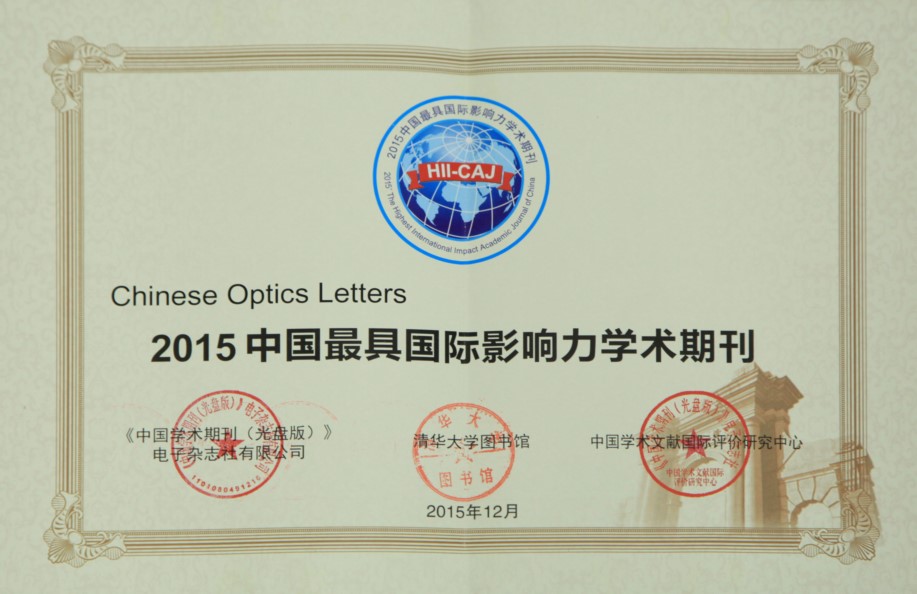 12月18-19日,中国学术期刊未来论坛在北京举行,中国学术期刊(光盘版)电子杂志社有限责任公司和清华大学图书馆在会上联合发布了《2015中国学术期刊国际国内影响力研究报告》,并公布了2015年度“中国最具国际影响力学术期刊”和“中国国际影响力优秀学术期刊”名单。上海光机所主办、中国激光杂志社出版的Chinese Optics Letters和《光学学报》获得“2015中国最具国际影响力学术期刊”称号,《中国激光》获得“2015中国国际影响力优秀学术期刊”称号。