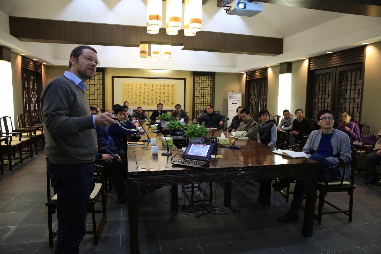 少体问题是超冷原子物理的研究热点之一,从两体相互作用形成的三体系统具有许多奇妙的特性,Efimov共振态就是其中之一。当系统中三个粒子之间存在两两相互作用时,通过调节原子间的相互作用,可以形成三粒子分子束缚态。报告中,Matthias Weidemüller教授介绍了其研究小组在超冷Li-Cs混合气体的一系列工作。实现了一个Li原子和两个Cs原子的三体复合,观测到多个Efimov共振峰,证实了Efimov共振对应的散射长度满足普适的标度率,其标度率和三个同核原子分子不同。中科院量子光学重点实验室的研究人员和Matthias Weidemüller教授就该报告进行了讨论交流。