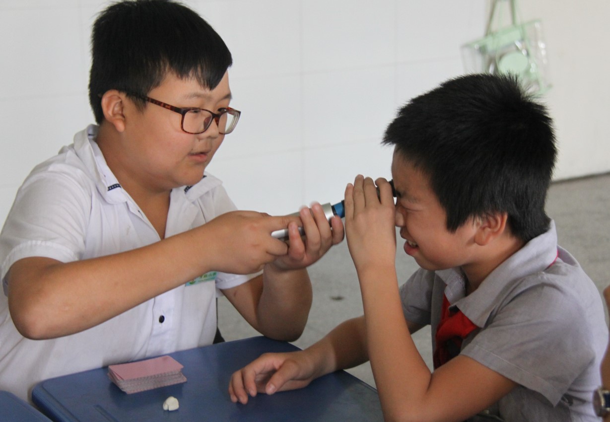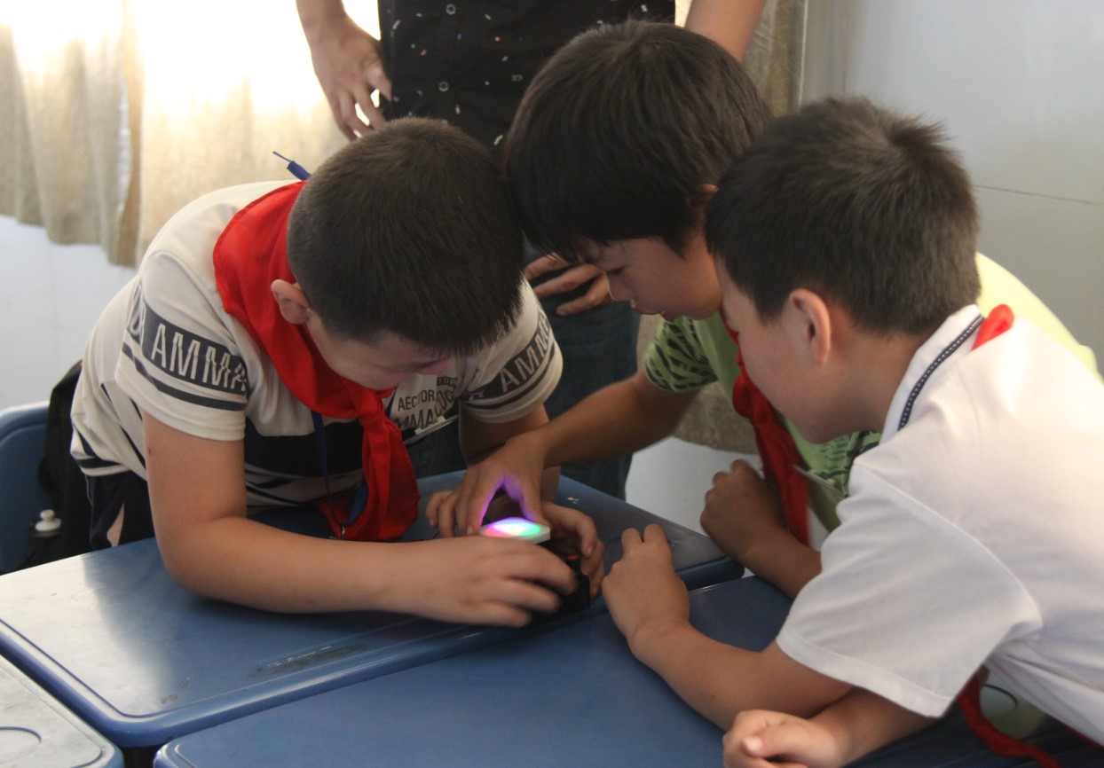 志愿者刘铁诚首先为学生们介绍了全国科普日的主题“创新放飞梦想,科技引领未来”。随后,他从刚刚成功发射的“天宫二号”开始,讲解了人类从古至今的计时装置演变,并重点讲述了由我所科研人员研制的“天宫二号”空间冷原子钟的相关科普知识。课堂中,小朋友们在志愿者李沙沙、刘耘志、李硕丰的带领下体验了“光的合成”与“光的分解”的两项科普实验,大家亲自动手“合成”和“分解”了白光。同学们对于平时校园课堂中较为难得的最新科技知识和有趣的科学动手小实验听讲的十分认真,课堂在轻松活泼的氛围中进行。
