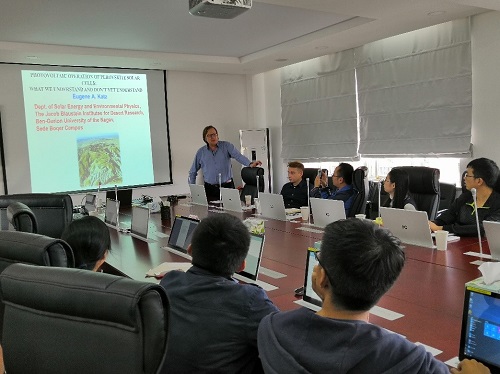 研讨会上,Eugene A. Katz教授基于有机-无机复合钙钛矿材料的太阳能电池在光伏薄膜研制方面取得的突破,主要从钙钛矿太阳能电池在室温下高开路电压(Voc)的起源、太阳能电池主要光伏参数的温度依赖特性、钙钛矿材料高发光效率和太阳能电池低辐射效率直接的矛盾等几个方面展开论述。报告结束后,与会科研人员与Katz教授就相关问题展开了深入讨论和交流。