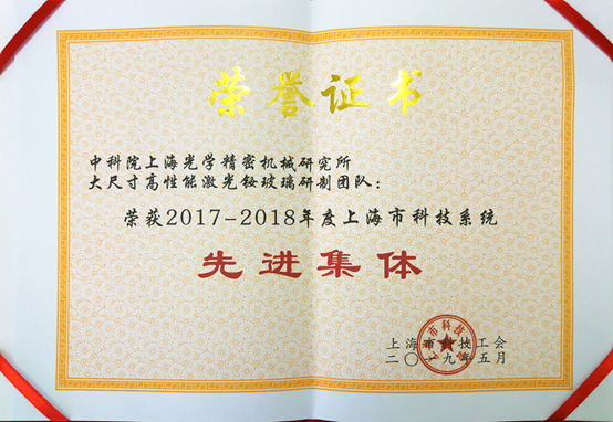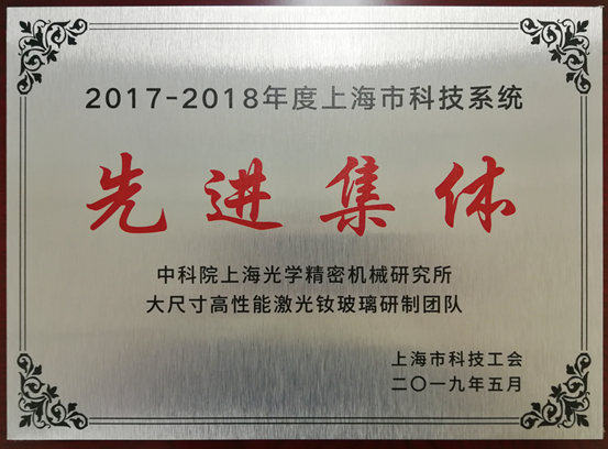 5月24日,由上海市科技工会主办的“‘科创先行者、建功新时代’上海市科技系统职工首届劳动技能大赛” 在中科院生科院正式启动,会上公布了2019年度全国、上海市五一奖项、2017-2018年度上海市科技系统先进集体和个人等获奖名单。上海光机所大尺寸高性能激光钕玻璃研制团队荣获“2017-2018年度上海市科技系统先进集体”称号。
