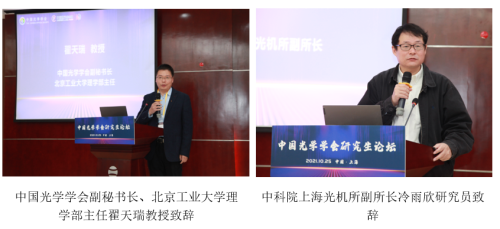开幕式上,中国光学学会副秘书长、北京工业大学理学部主任翟天瑞教授,中科院上海光机所副所长冷雨欣研究员为论坛致辞。他们认为,光学的未来在青年,青年一代茁壮成长,光学科技才能生生不息。中国光学学会研究生论坛(上海)为研究生搭建了交流平台,能够在热烈的对话中享受累累硕果,在学术交会中品味科研的魅力。上海理工大学詹其文教授主持了开幕式。
