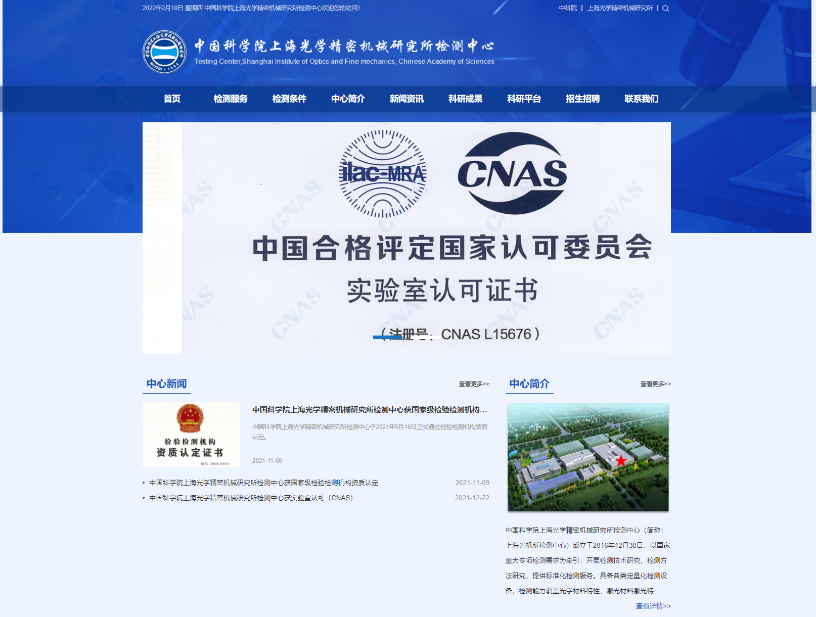 中国科学院上海光学精密机械研究所检测中心(简称上海光机所检测中心)于2021年5月18日正式通过中国检验检测机构资质认定(CMA),2021年12月16日正式通过中国合格评定国家认可委员会实验室认可(CNAS),并建立了官方网站,于2022年1月30日正式发布运行,网址为:http://jczx.siom.ac.cn/。