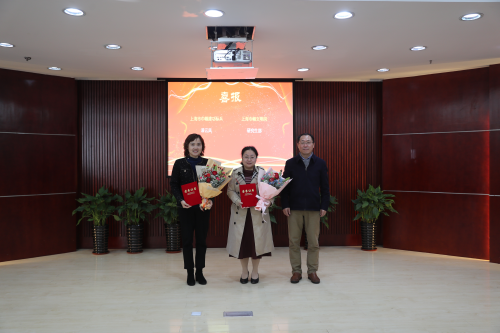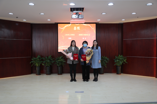 邵建达为获得“上海巾帼文明岗”荣誉称号的研究生部金黎慧副主任以及获得“上海市巾帼建功标兵”荣誉称号的漆云凤颁奖。