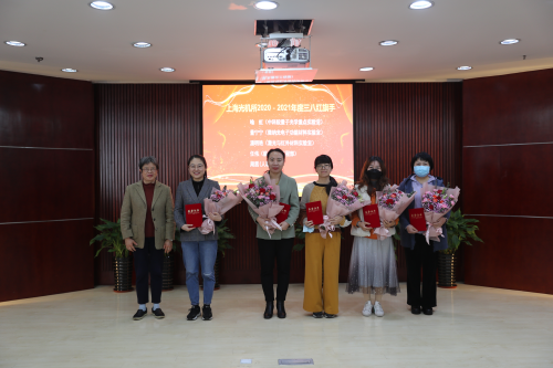 全国妇联执委、上海分院妇委主任胡丽丽为获得“上海光机所2020-2021年度三八红旗手”荣誉称号的喻虹、董宁宁、潘明艳、任伟、周茜颁奖。