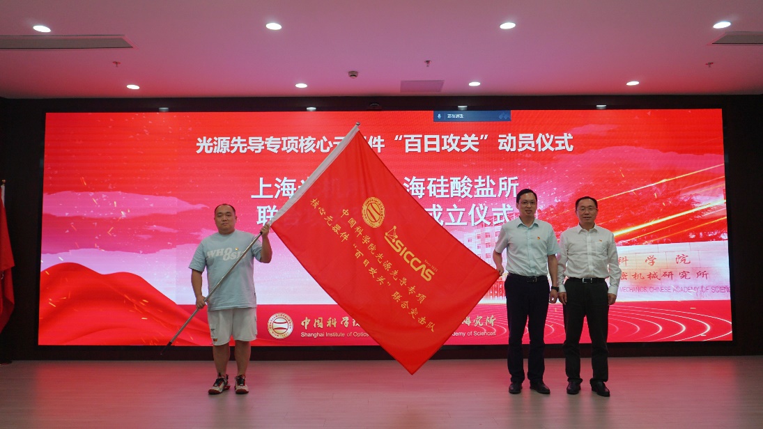 上海光机所党委书记邵建达为两家单位的课题组负责人——上海光机所于飞研究员和上海硅酸盐所周志勇研究员,授“联合攻关突击队”旗。