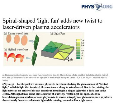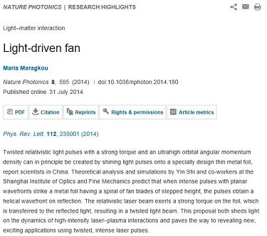 上海光机所强场激光物理国家重点实验室2014年6月10日发表在国际物理学期刊《物理评论快报》上的论文“Light Fan Driven by a Relativistic Laser Pulse”[Phys.Rev.Lett.112, 235001(2014), http://journals.aps.org/prl/pdf/10.1103/PhysRevLett.112.235001],提出利用相对论强激光照射特殊设计的结构靶(光扇)来研究角动量效应。该研究发现,结构靶(光扇)在强激光的照射下高速旋转,同时反射具有角动量的相对论拉盖尔-高斯光。(“上海光机所首次研究相对论强激光的角动量效应取得重要进展,《上海光机所知识创新工程工作简报》,6月12日报道)