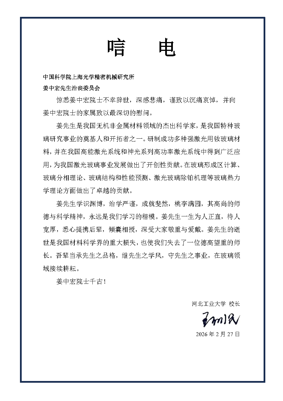 河北工业大学 王利民校长 唁电