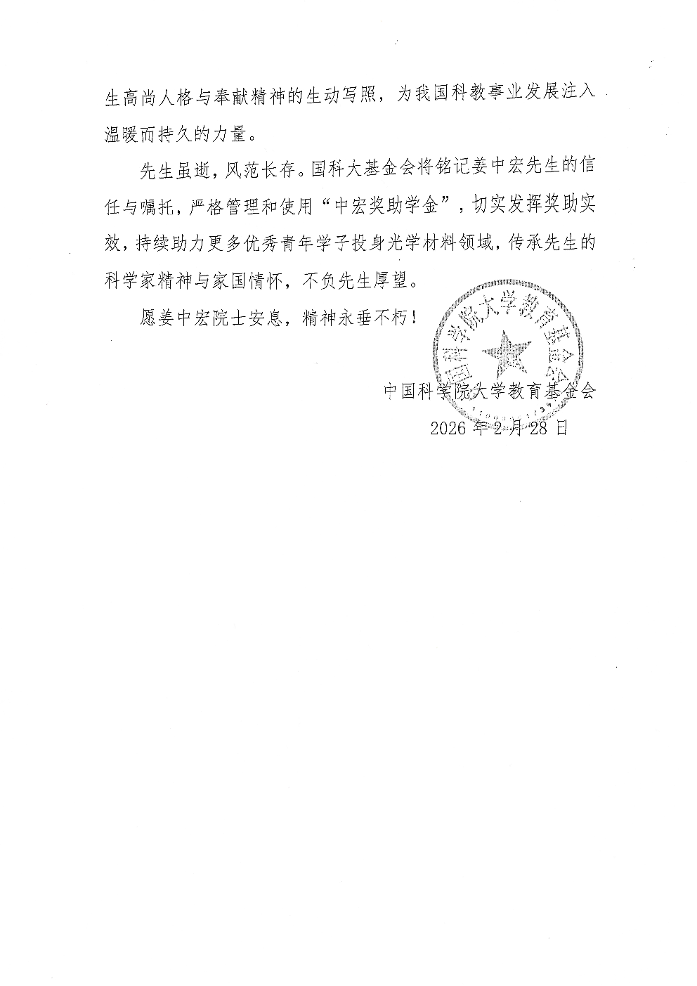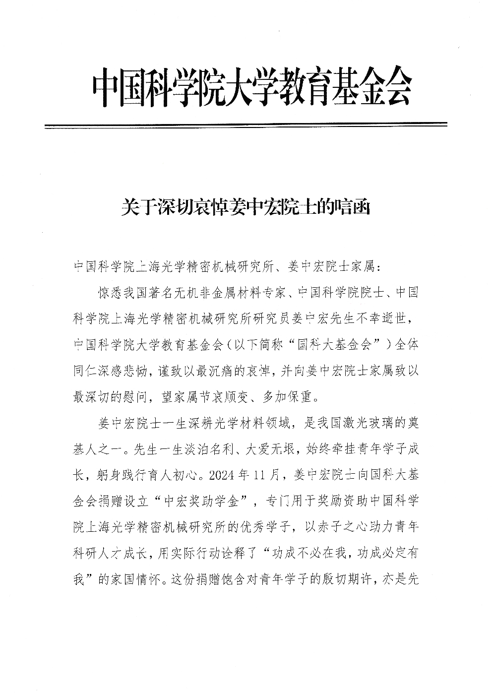 中国科学院大学教育基金会 唁电