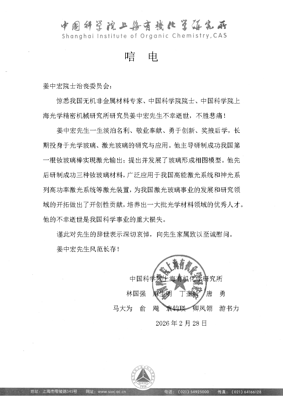 中国科学院上海有机化学研究所全体院士 唁电