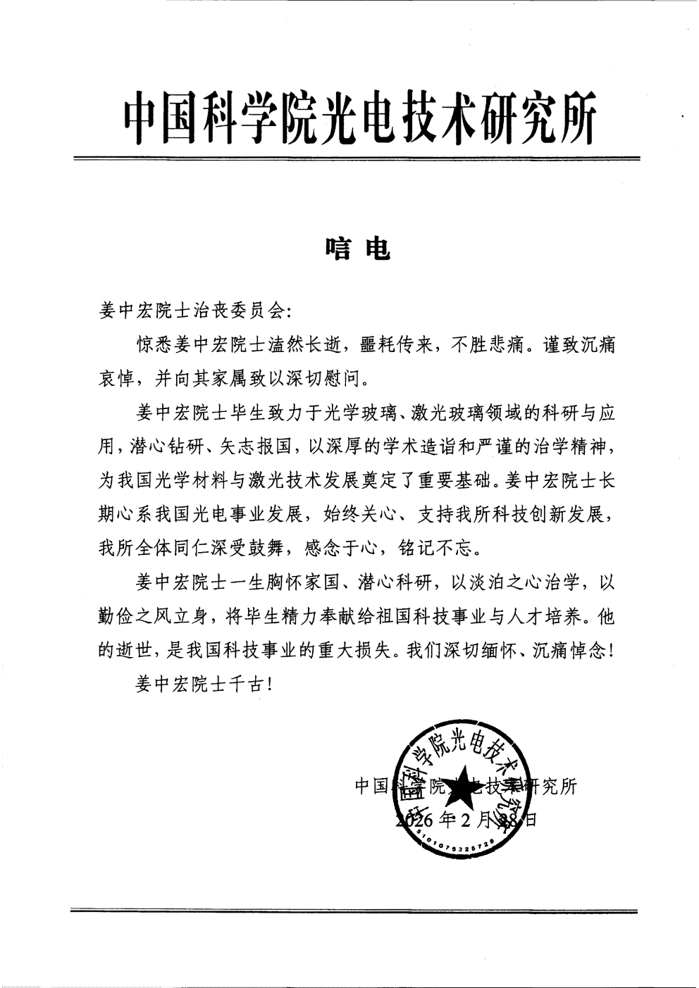 中国科学院光电技术研究所 唁电