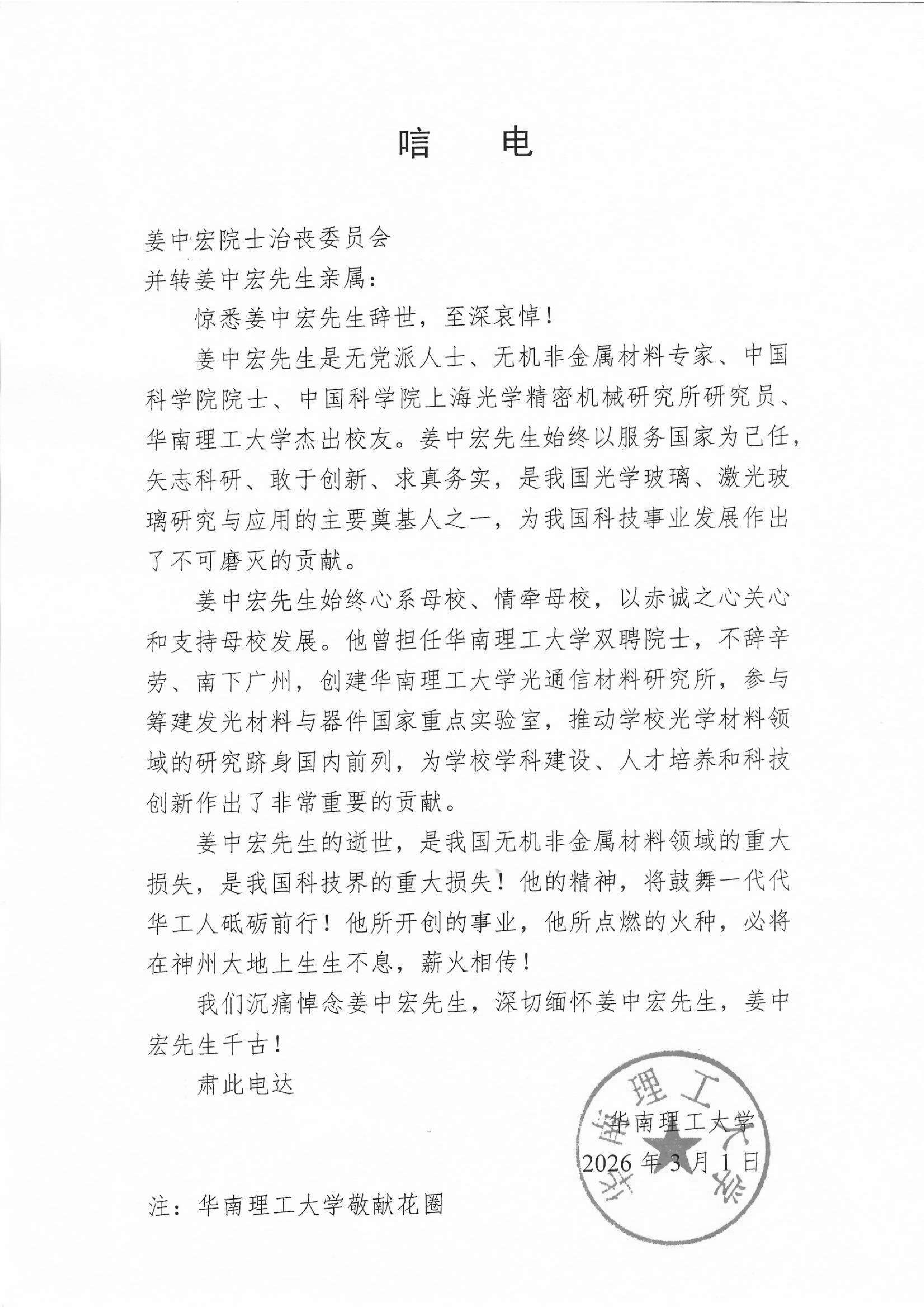 华南理工大学 唁电