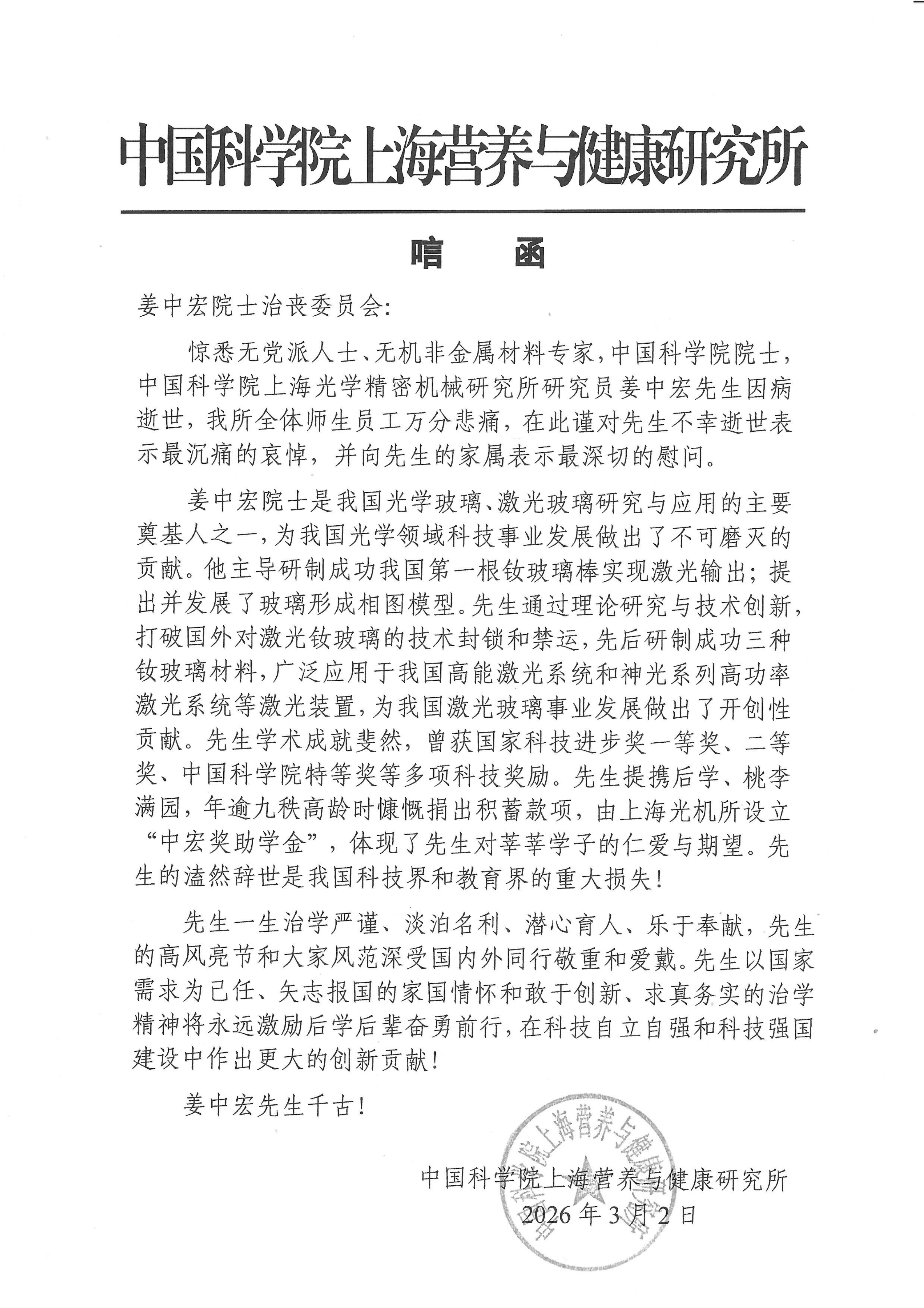 中国科学院上海营养与健康研究所 唁电