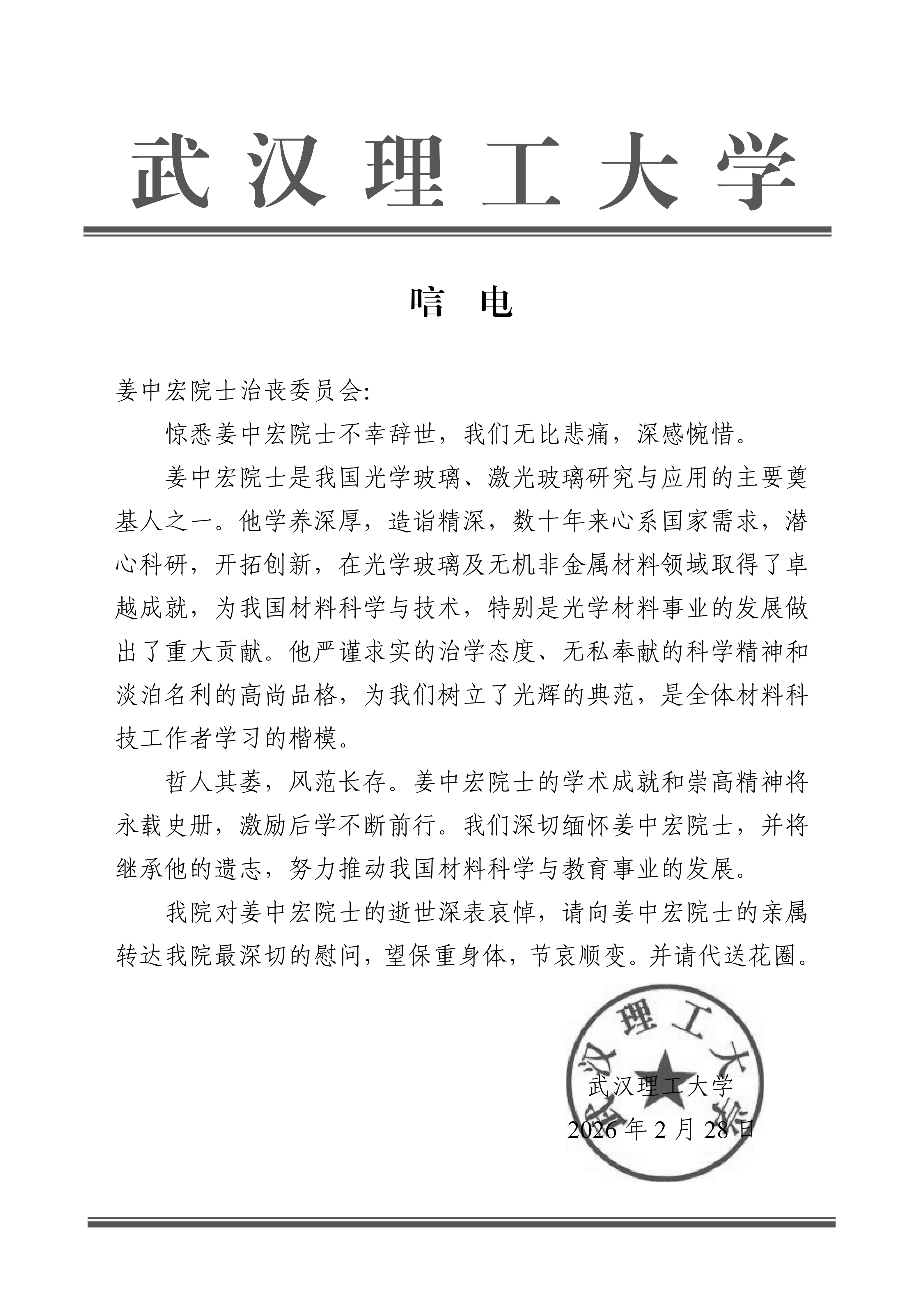 武汉理工大学 唁电