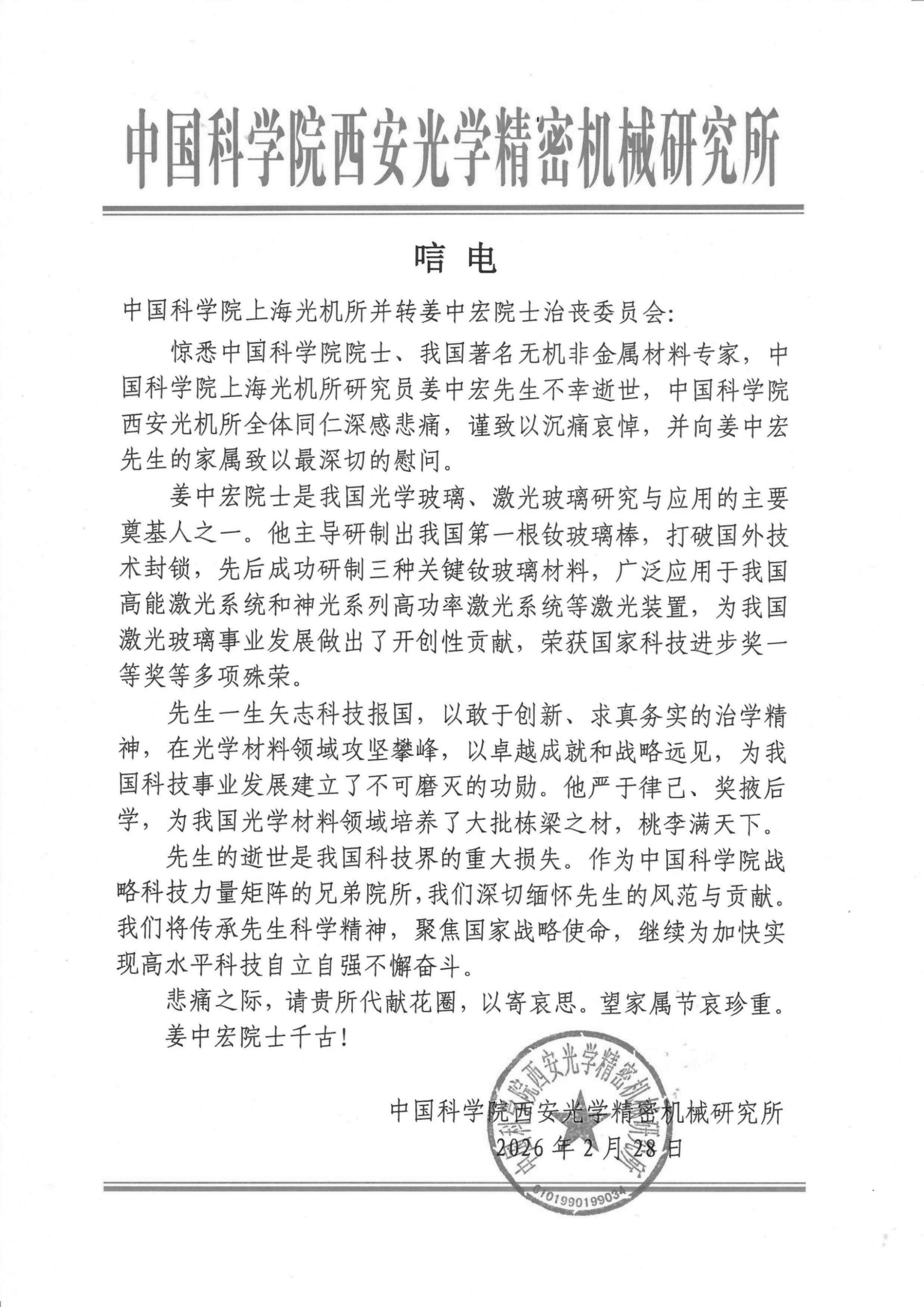 中国科学院西安光学精密机械研究所 唁电