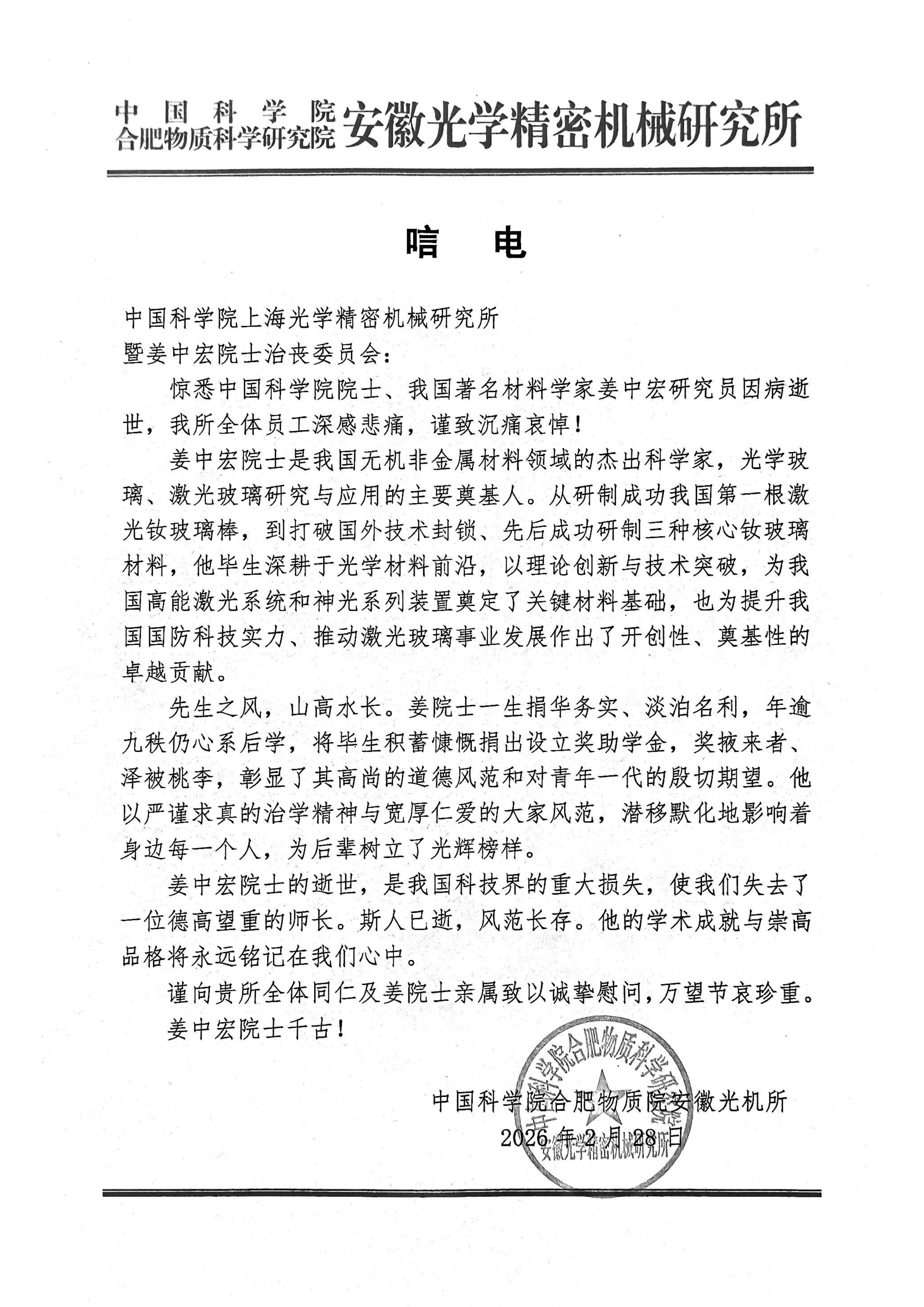 中国科学院合肥物质院安徽光学精密机械研究所 唁电