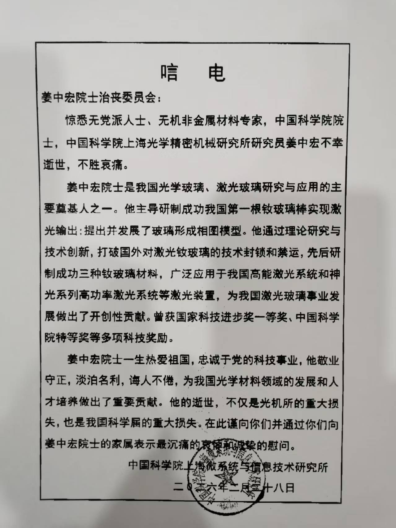 中国科学院上海微系统与信息技术研究所 唁电