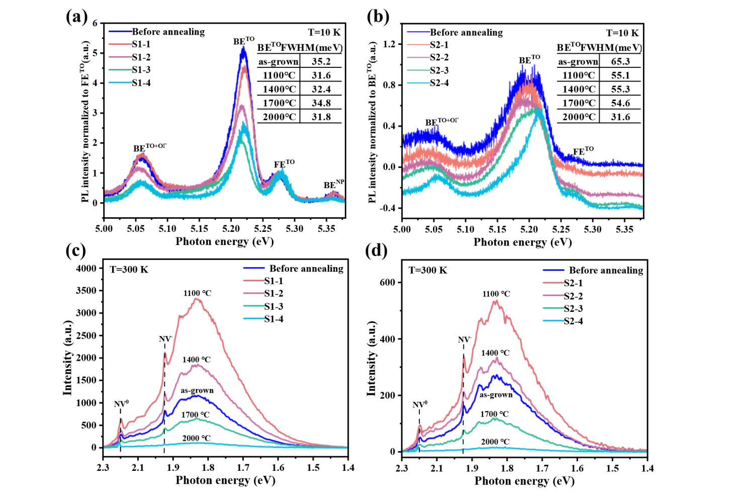 图2 不同退火温度的BDD样品 (a) 213 nm激发的低温(10 K)光致发光光谱;(b) 532 nm激发的室温(300 K)光致发光光谱。