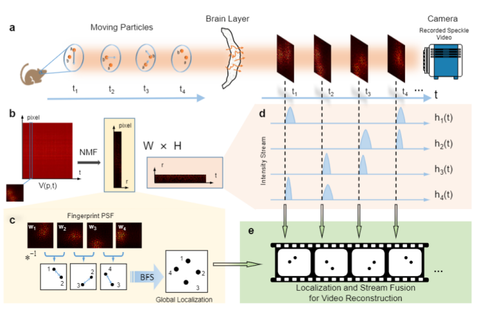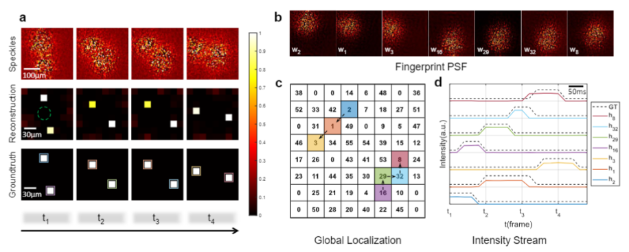 研究人员提出,将隐藏在散射介质后方的动态目标运动视为一种随机激活,这等效于传统基于非负矩阵分解散射重建方法中的随机编码,从而允许以散斑的相机采集帧率对动态场景进行重建。该方法不依赖任何散射介质的先验信息,只需要在介质外部采集动态散斑图案并作为数据立方体进行处理,即可重建出高帧率的动态场景。其另一核心突破在于,全局定位重建过程物点源的指纹点扩散函数(PSF)解卷积参考不仅能利用当前帧的其他物点信息,还能借助之前或之后任意帧的物点来辅助定位,从而有效突破单帧内超出记忆效应范围的孤立物点难以重建的限制。