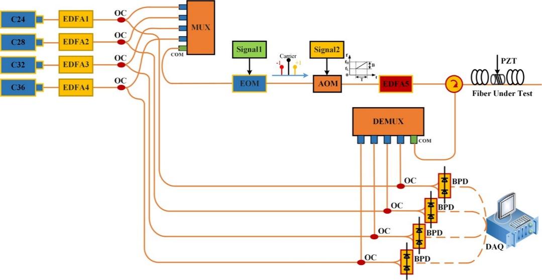 近日,中国科学院上海光学精密机械研究所空天激光技术与系统部在高性能分布式光纤声波传感技术研究中取得重要进展。研究团队提出并验证了一种基于1440级波长-频率-时间-空间(WFTS)大规模分集合并技术的相位敏感光时域反射仪(Φ-OTDR)系统,有效解决了传统Φ-OTDR系统中传感距离与信噪比相互制约的难题。相关研究成果以“High-SNR Φ-OTDR based on the 1440-level diversity merging technique”为题,发表于Optics Express。