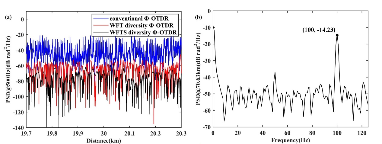 针对上述挑战,研究团队创新性地将波长、频率、时间和空间四种分集技术进行级联,在不显著增加硬件复杂度的前提下,实现了1440级的大规模分集合并。该方案通过多波长激光源、多频带调制、脉冲压缩技术以及时间维度上的信号平均,有效抑制了干涉衰落,显著提升了系统的信噪比。实验结果表明,该系统在20km传感距离上实现了-77.4dB@500Hz的平均底噪,相比传统Φ-OTDR系统,信噪比提升了28.5dB。同时,系统成功解调了70.63km处的100Hz外部扰动信号,验证了其超长距离探测能力。该技术为构建高性能、长距离的分布式声波传感系统提供了有效技术路径,有望推动其在海洋安全监测、地质资源勘探等领域的应用。