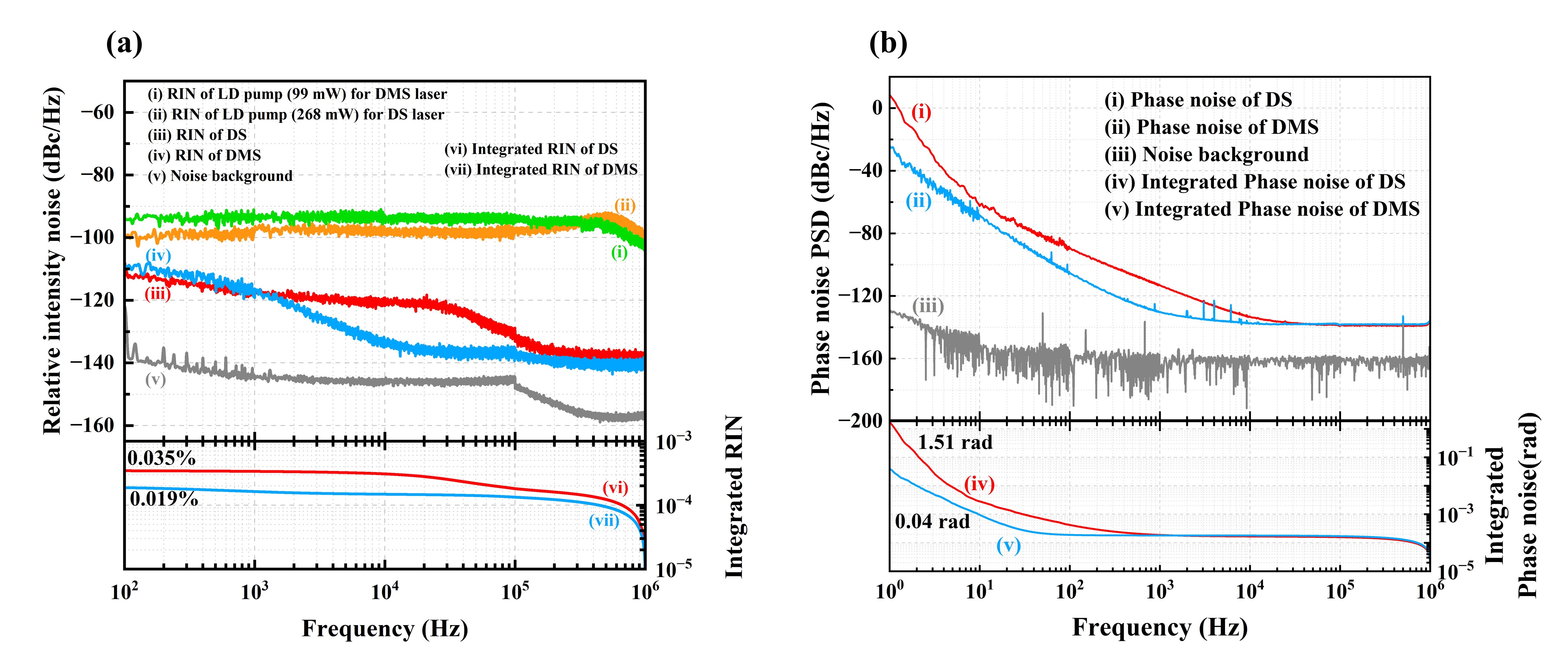 针对上述问题,研究团队搭建了两台全光纤9字腔掺钕锁模激光器(图1),分别工作于耗散孤子和色散管理孤子两种锁模机制。系统测量并对比了两种机制下的相对强度噪声(RIN)和重复频率相位噪声(图2),分析了不同频段的噪声来源。实验结果表明:色散管理孤子激光器凭借强自振幅调制饱和效应,可有效抑制强度噪声,RIN积分值仅为0.019%;同时,由于不同噪声间时频耦合作用较弱,其积分相位噪声低至0.04 rad。相比之下,耗散孤子激光器利用腔内窄带滤波将RIN积分值控制在0.035%,但由于输出脉冲啁啾较大、脉宽较宽,积分相位噪声高达1.51 rad。该研究为实现激光锁模机制与不同应用场景的精准匹配提供了科学依据,有望进一步推动超快掺钕光纤激光在生物成像、光学计量等前沿领域的应用。