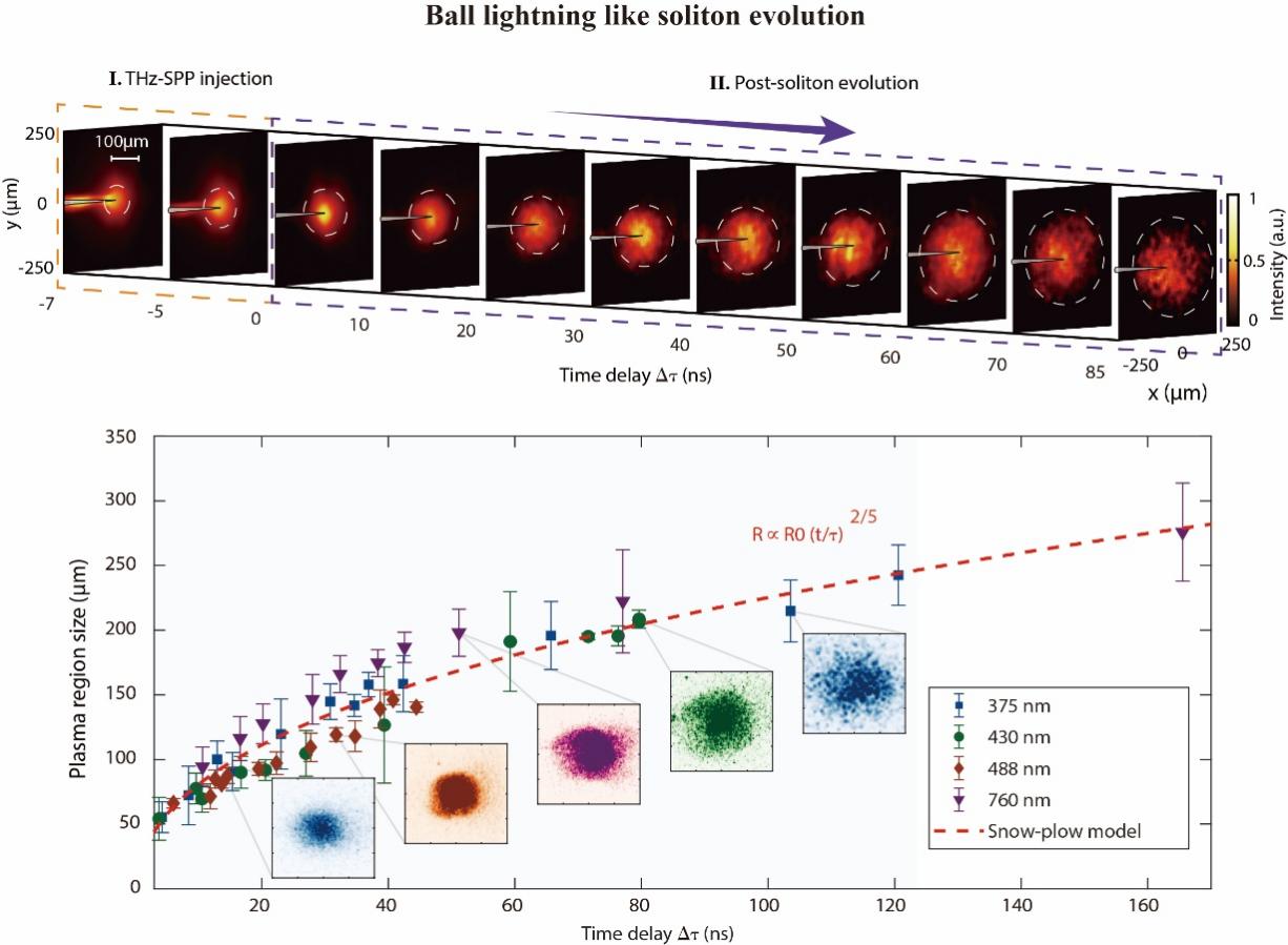 基于上述积累,研究团队进一步利用纳米尖端的近场增强效应,将激光驱动金属丝产生的太赫兹表面波导引至纳米级针尖,借助其亚波长约束特性(约50nm),在针尖区域实现了场强超过10 GV/m的相对论强度近场场强,为电磁孤子的产生提供了理想的驱动源。科研团队将该太赫兹近场导入至高速氩气喷流中,氩气在太赫兹强场作用下被迅速电离,形成参数精准可控的等离子体环境。借助自主搭建的高速成像系统,研究团队首次完整捕捉到球形太赫兹电磁孤子从形成、膨胀到耗散的全过程,其演化时间超过百纳秒,较传统近红外激光驱动的孤子提升了4–5个数量级。该球形孤子初始尺寸约80微米,其尺寸演化遵循 R∝t2/5标度律。其发射光谱覆盖紫外至红外波段,对发射光谱的精确解析显示,孤子电子温度在百纳秒时间内由约6 eV(约7万摄氏度)逐渐下降至0.5 eV(约6千摄氏度),这一缓慢冷却过程证实孤子内部存在持续能量注入——即被等离子体空腔俘获的太赫兹波。正是太赫兹辐射压与球壳等离子体热压之间的动态平衡,使该电磁孤子实现了远超普通热等离子体寿命的自持演化,为球状闪电的长寿命之谜提供了清晰的实验判据。