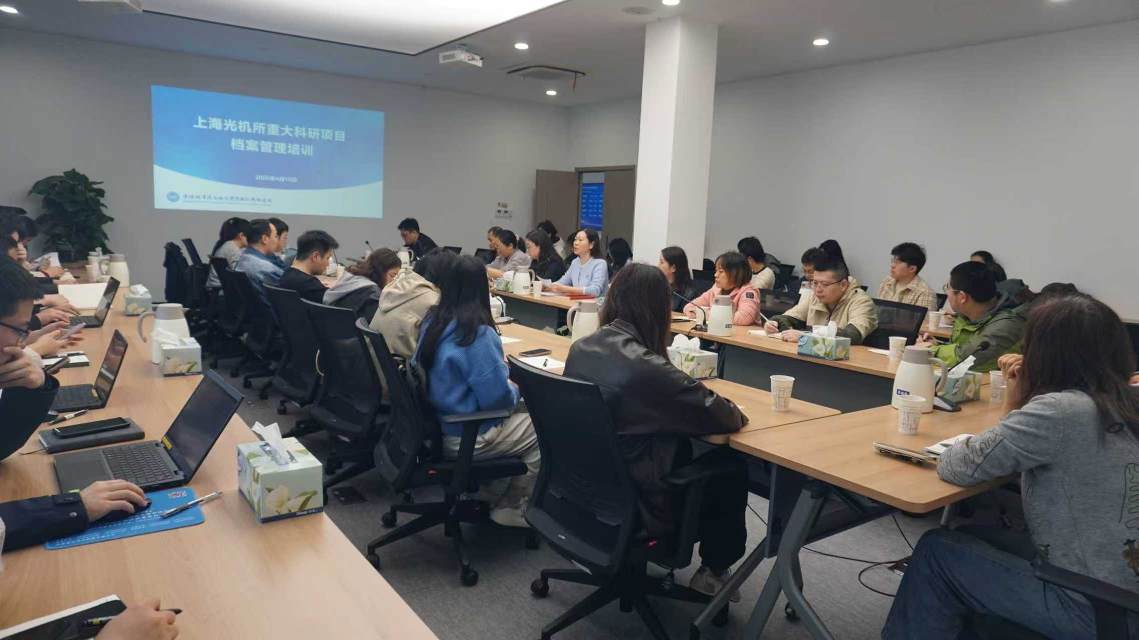 为深入贯彻落实中国科学院档案工作最新部署,全面提升重大科研项目档案管理规范化、专业化水平,4 月 10 日,上海光学精密机械研究所召开2026 年重大科研项目档案管理专题培训。所纪委书记彭芳、综合档案室专职人员、全所各类重大项目主管和兼职档案员50多人参会,会议由综合档案室主任吴燕华主持。